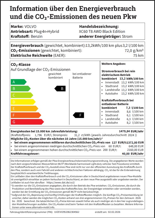 CO2 Emissionen kombiniert: 71 g/km CO2-Klasse: B; CO2 Emissionen bei entladener Batterie kombiniert: 165 g/km CO2-Klasse: F